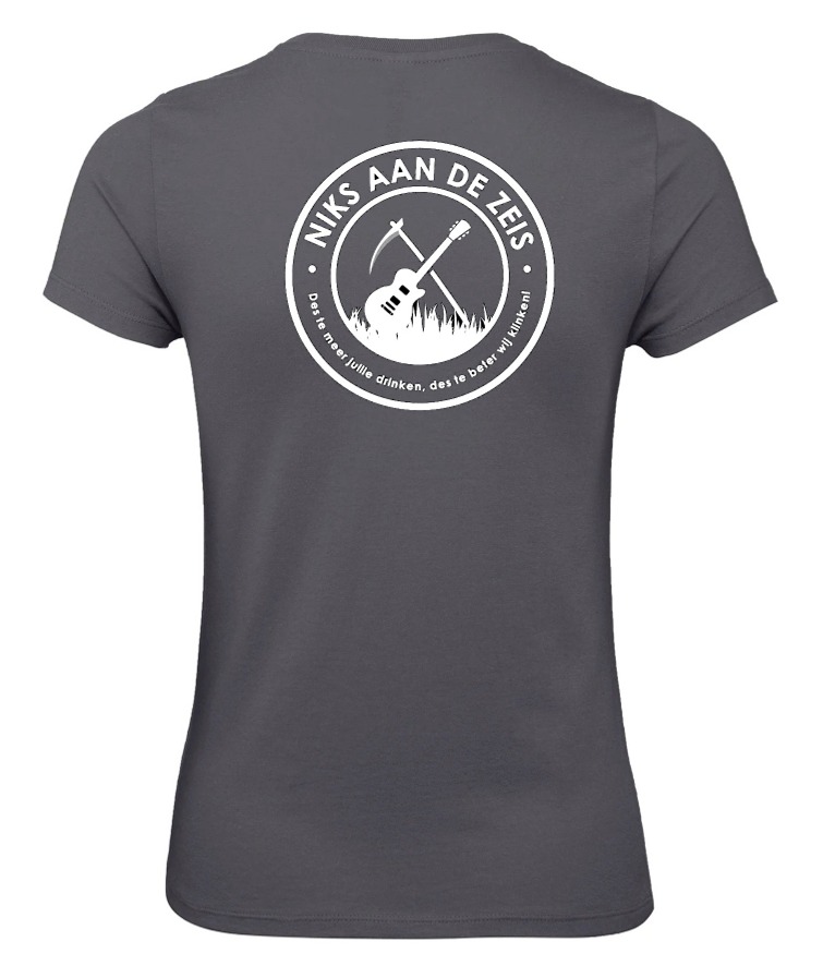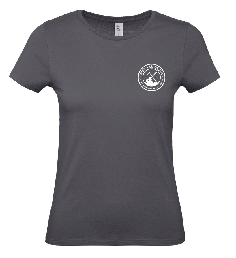 Eindelijk daar: het Niks aan de Zeis dames T-shirt – met het iconische witte ronde logo – laat zien dat je erbij hoort!